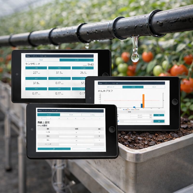 あぐりウォーター日射比例式潅水、電磁定量ポンプによる施肥、8系統の潅水制御に対応した自動潅水・施肥制御盤です。